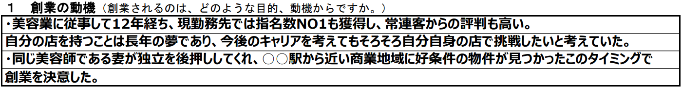 創業計画書の最初の項目である「創業の動機」は、美容室を開業する理由や目的を明確に伝える部分です。単に「独立を勧められたから」といった理由では、事業を継続する意志やビジョンが伝わりにくくなります。そのため、具体的な動機をしっかりと記載することが重要です。