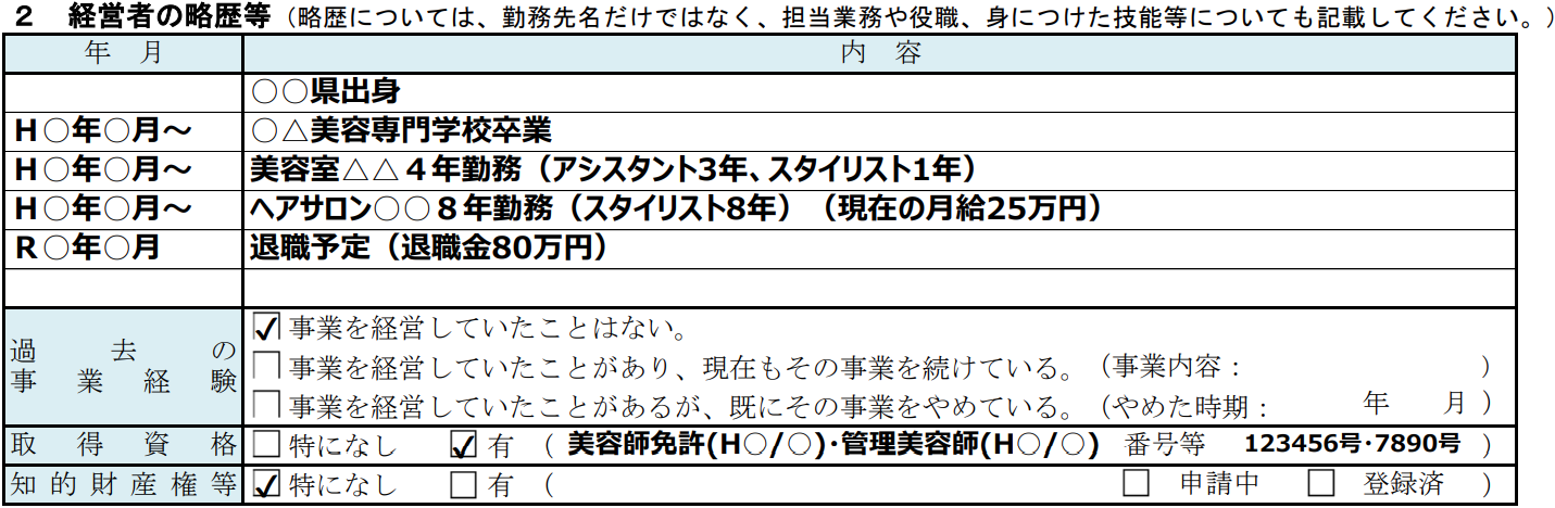 「経営者の略歴等」は、経営者の美容師としての実績やスキルを示す重要な項目です。金融機関にとっては、事業の継続性や安定性を判断する基準となるため、経験や強みを具体的に記載することが求められます。特に、勤務年数や担当業務の詳細に加え、マネジメント経験や受賞歴がある場合は積極的にアピールしましょう。また、過去に事業経験がある場合は、廃業に至った理由や今回の創業でどのように改善していくのかも記載することが大切です。
