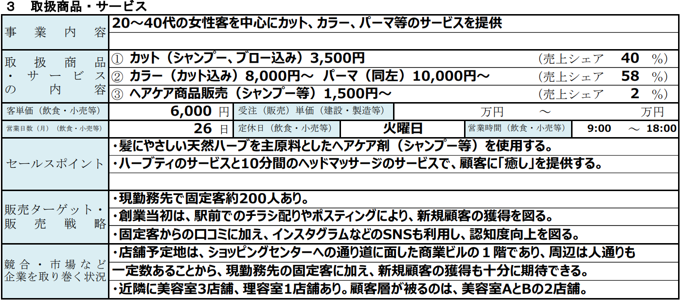 以上の記入例では、具体的なメニューやターゲット層を記載し、競合との差別化ポイントを明確にしています。特に、オーガニック製品を使った髪質改善という強みをアピールし、他店にはない独自の魅力を伝えました。また、ターゲット層の年齢層を限定することで、事業の方向性をより具体的に示しています。