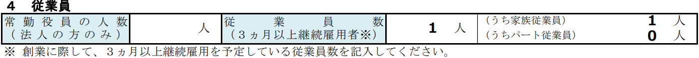 従業員欄には、法人の場合のみ記入する常勤役員の人数と、3か月以上継続雇用予定の従業員数を記載します。従業員数には、家族従業員やパート従業員の人数も内訳として記載し、事業運営の体制が具体的にわかるようにしましょう。