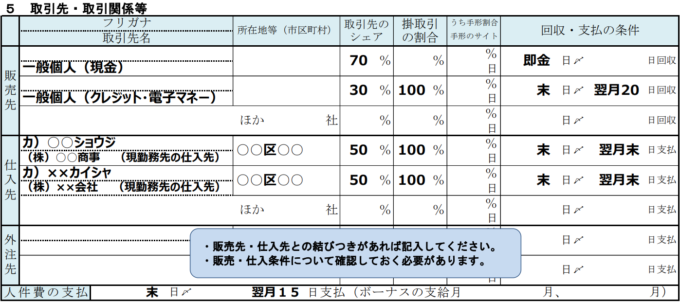 取引先・取引関係の欄には、見込み顧客や仕入先の情報を具体的に記載します。「一般個人」といった抽象的な表現だけでは、事業の具体性が伝わりにくいため、ターゲット顧客の特性や獲得戦略を追記しましょう。