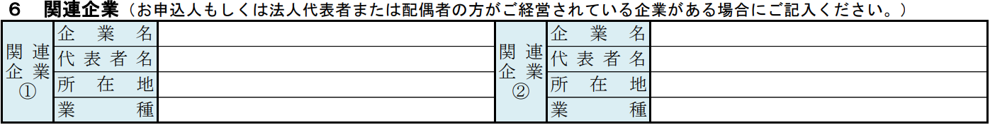 この項目には、申請者本人や法人代表者、配偶者が経営する企業の情報を記載します。関連企業がない場合は、空欄のままで問題ありません。