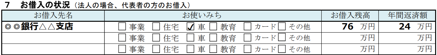 | お借入先名 | お使いみち | お借入残高 | 年間返済額 |