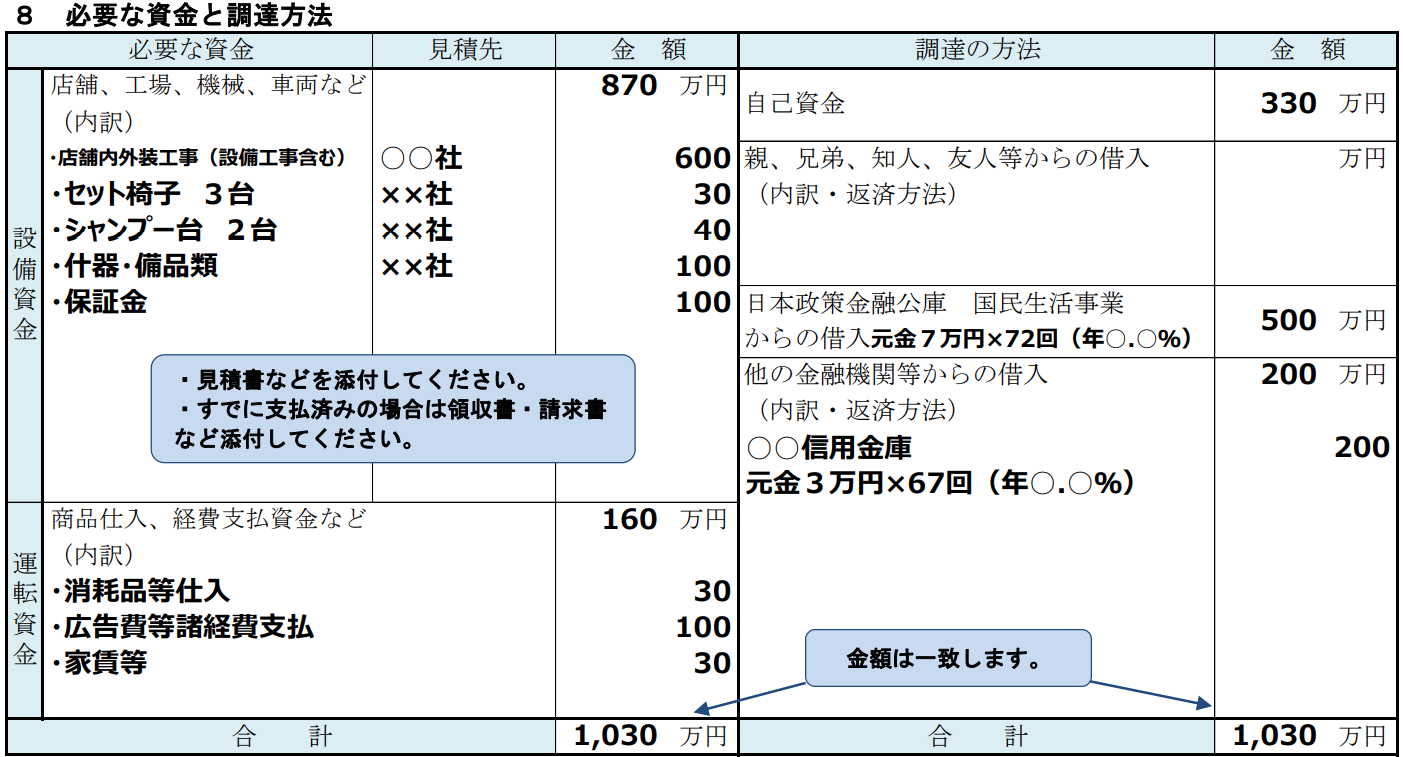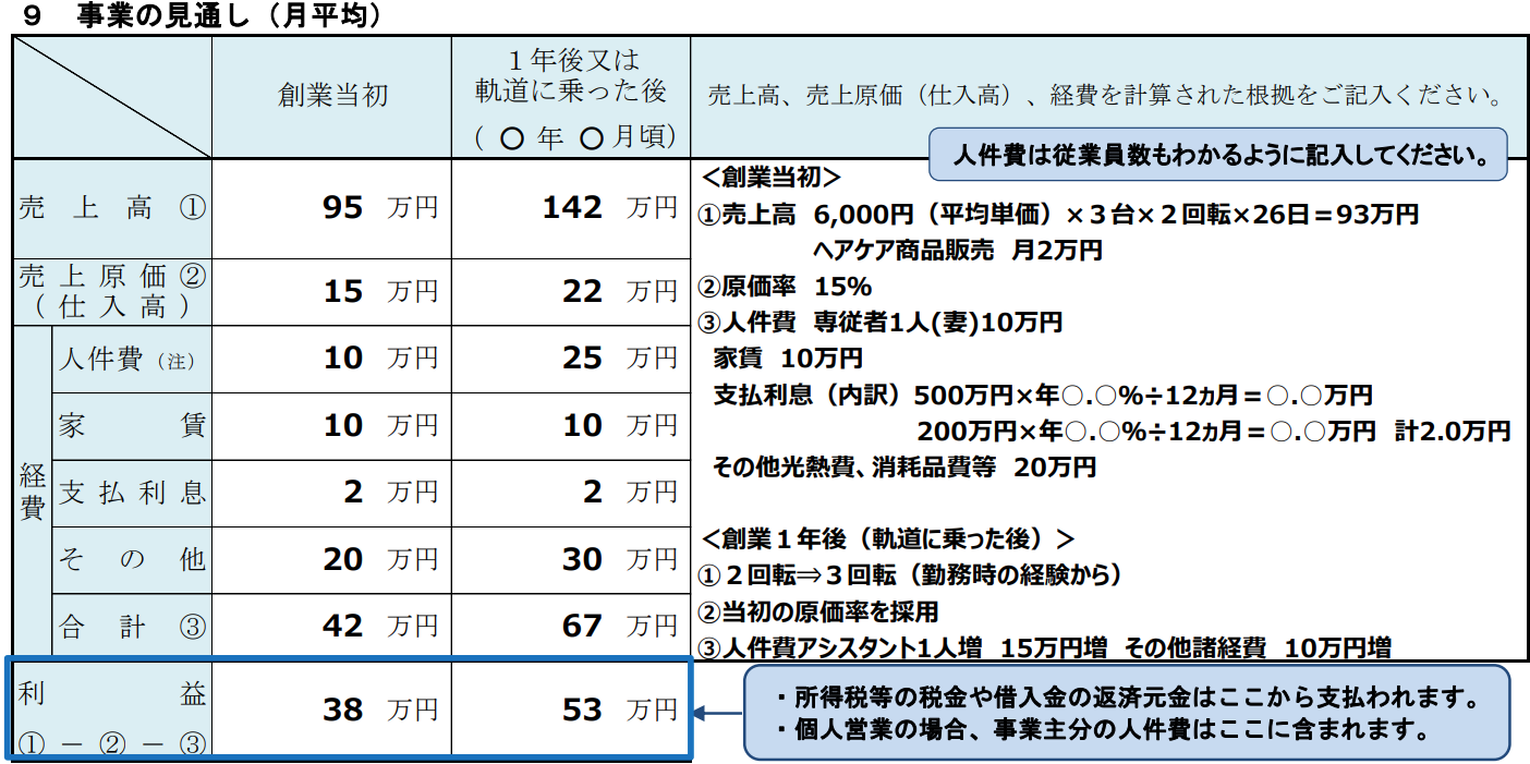 画像引用:創業計画書記入例(美容業)|国民生活事業|日本政策金融公庫 ![]()