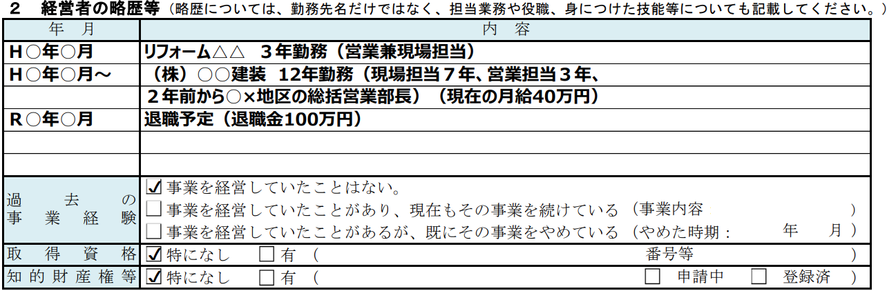 経営者の略歴等を書いていきます。この項目には、学歴や、経歴、事業経験、資格、知的財産権等について記載します。