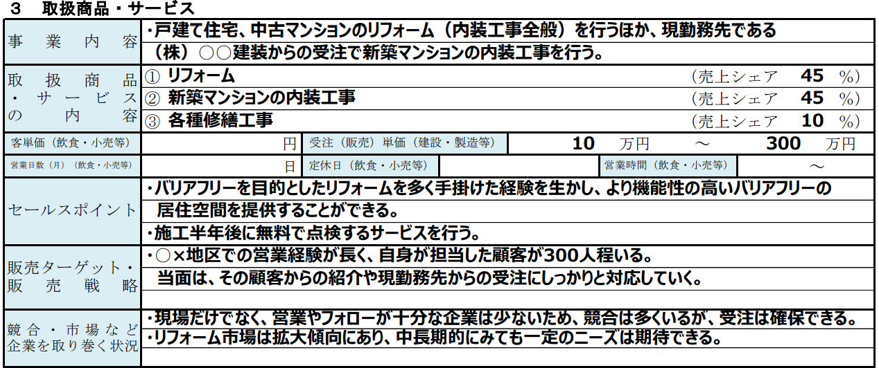 次に、事業で提供しようと思っている商品やサービスについて記載します。商品・サービスを「住宅リフォーム」「修繕工事」などのように詳しく記載し、セールスポイントや販売するターゲットおよび戦略、競合他社や市場などの企業を取り巻く状況についてまとめます。