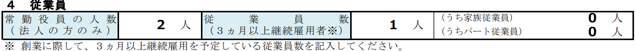 創業の際に雇用する従業員の予定数を、具体的に記載します。極端に多すぎたり少なすぎたりと、予定している業務量や売上と矛盾しないように注意が必要です。なお、従業員を雇用しない場合には、面談の際にご自身が体調不良などで業務ができなくなった際の対応策を尋ねられる可能性があります。
