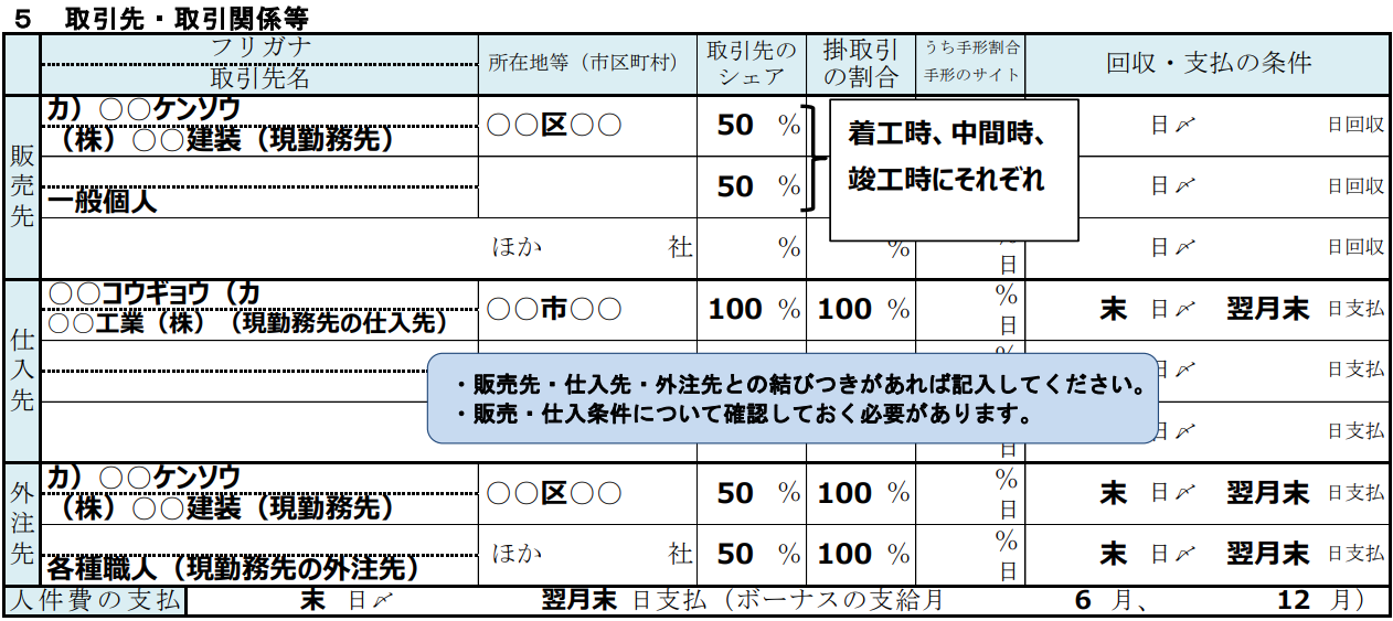 取引先・取引関係等の記入例は販売先、仕入先、外注先、人件費の支払に分けてご紹介します。