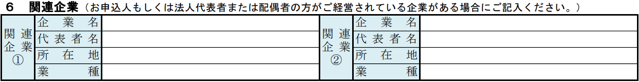 本人もしくは法人代表者、または配偶者が経営している企業がある場合には、関連企業として「企業名」「代表者名」「所在地」「業種」を記入します。関連企業がなければ、空欄のままで問題ありません。