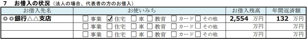| ○○銀行○○支店 | 事業✓住宅 車 教育 カード その他 | 2,000万円 | 100万円 |