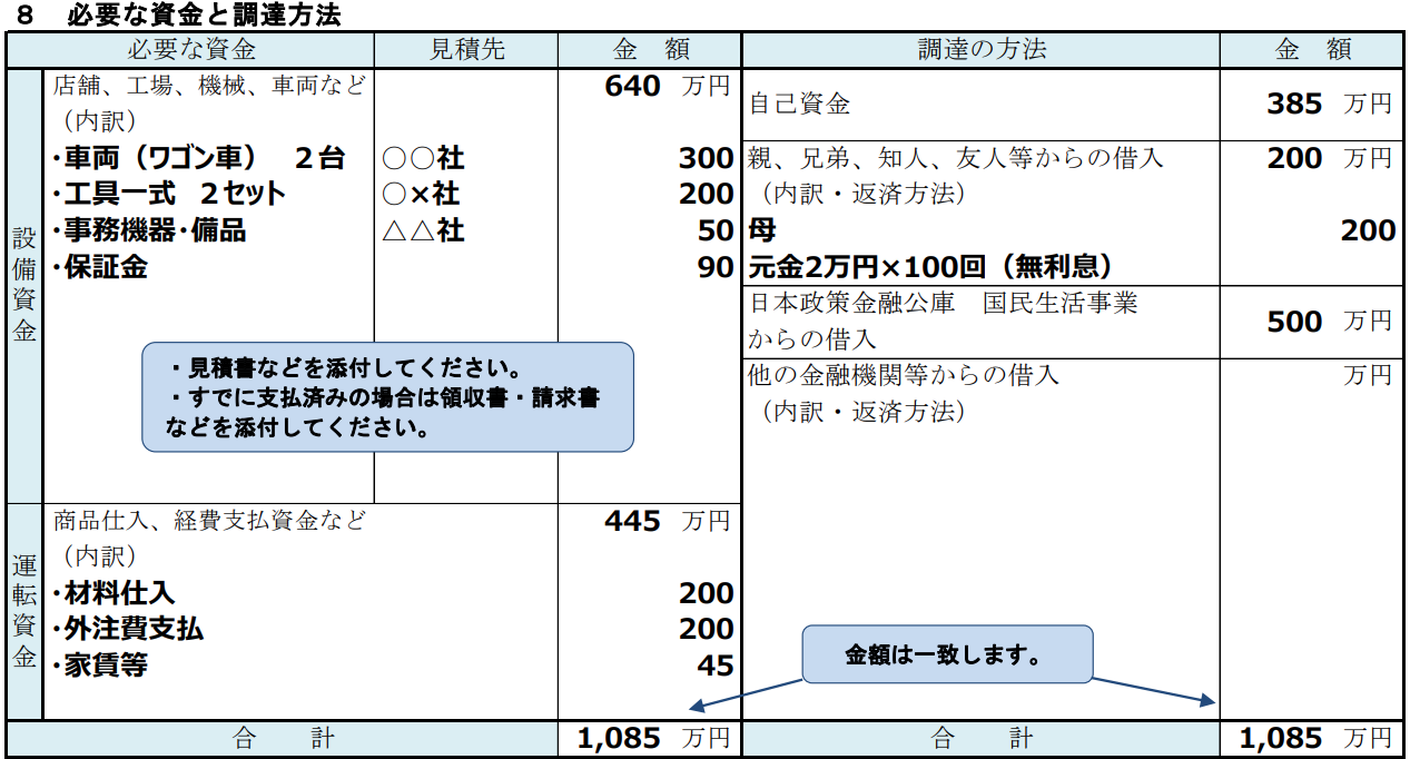 「自己資金」、「親、兄弟、知人、友人などからの借入」、「他の金融機関などからの借入」、「日本政策金融公庫などからの借入」の合計額を記入します。